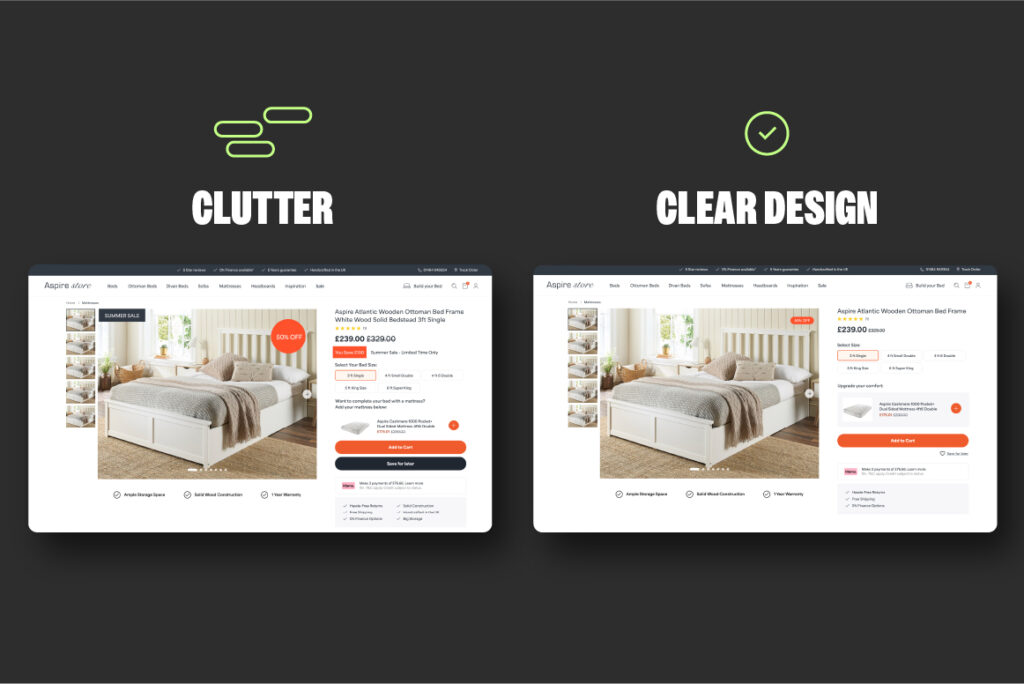 A complicated or unclear experience affects purchase intent due to shoppers not being able to assess a product, compare options or find the primary call to action.They lose momentum, buyer confidence plummets and they’re far less likely to add items to their basket.